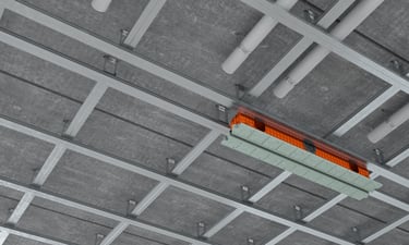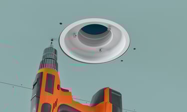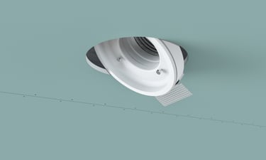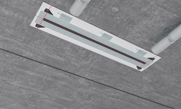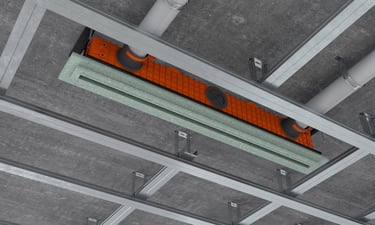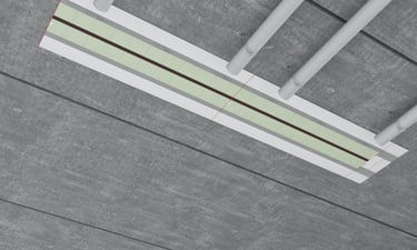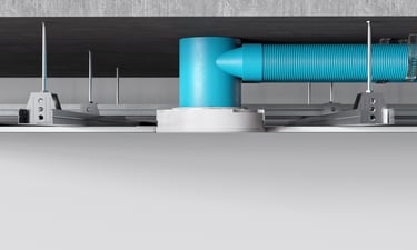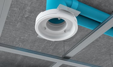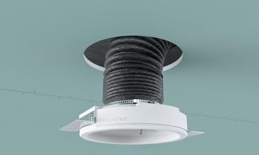 Ei näkyviä reunoja! Sileä ja integroitu katto! Tämä kipsiventtiili on osa ilmanvaihtojärjestelmää. Se on integroitu kipsilevykattoon, sitten viimeistelty ja maalattu samalla värillä kuin katto. Näkyviin jää vain esteettinen aukko ilmavirtaukselle. Tämä on viimeisin trendi kodin muotoilussa